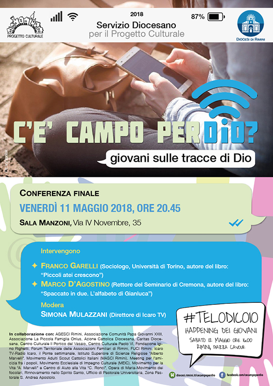 Venerdì 11 maggio 2018, alle ore 20:45, in Sala Manzoni (Via IV Novembre 35, Rimini), si svolgerà la conferenza “C’è campo per Dio? Giovani sulle tracce di Dio”, che affronterà il tema di quale esperienza di Dio vivono i giovani oggi; i relatori saranno il Prof. Franco Garelli, ordinario di Sociologia dei processi culturali presso l’Università degli Studi di Torino e autore del libro “Piccoli atei crescono”, e Mons. Marco D’Agostino, Rettore del Seminario di Cremona, che proporrà la storia di un giovane descritta nel suo libro “Spaccato in due. L’alfabeto di Gianluca”.
