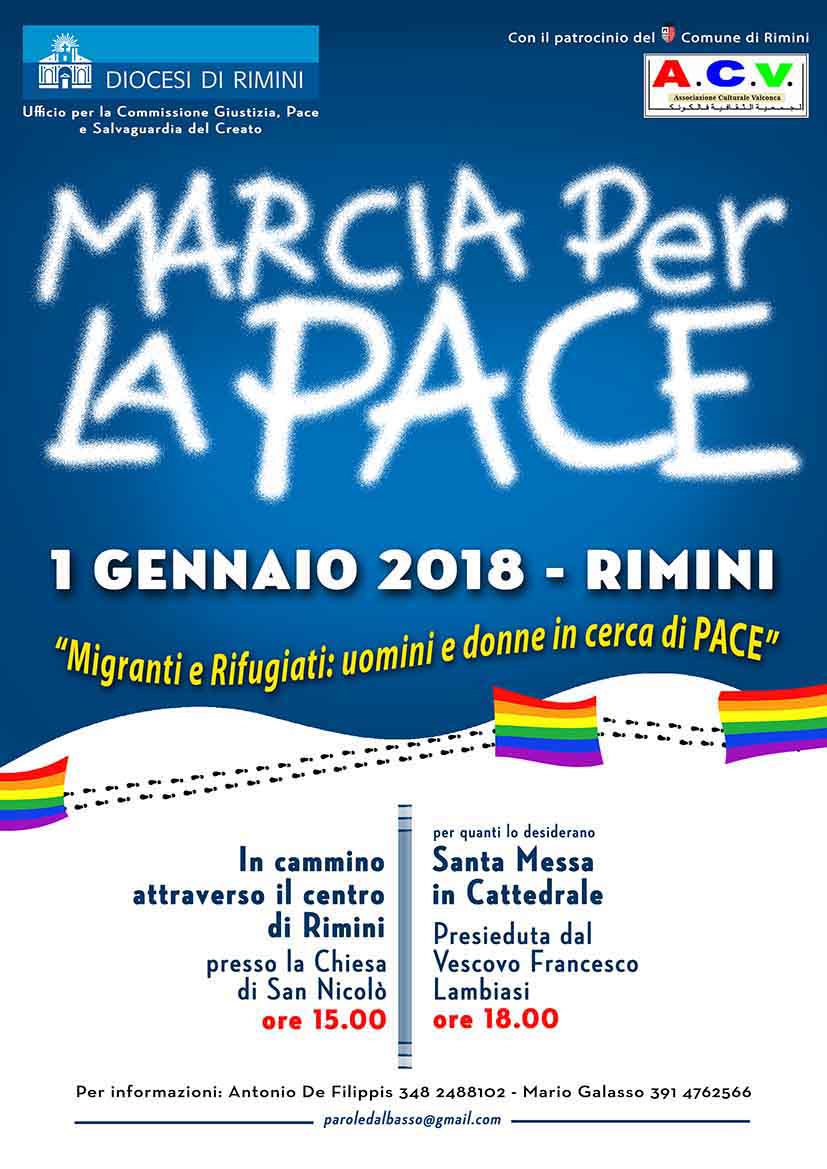 Anche quest’anno si terrà a Rimini, il 1° gennaio 2018 dalle ore 15 alle ore 18, per le vie del centro storico, la Marcia della Pace promossa dalla Diocesi di Rimini, in collaborazione con l’Associazione Musulmana A.C.V. (Associazione Culturale Valconca) e con il patrocinio del Comune di Rimini.