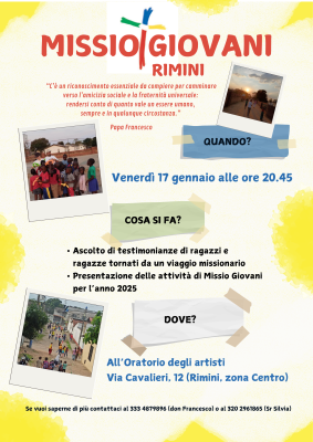 Venerdì 17 gennaio alle ore 20,45 verrà presentato il cammino formativo di Missio giovani dell’anno 2025 per coloro che vogliono avvicinarsi al mondo delle missioni o ai viaggi di condivisione missionaria.