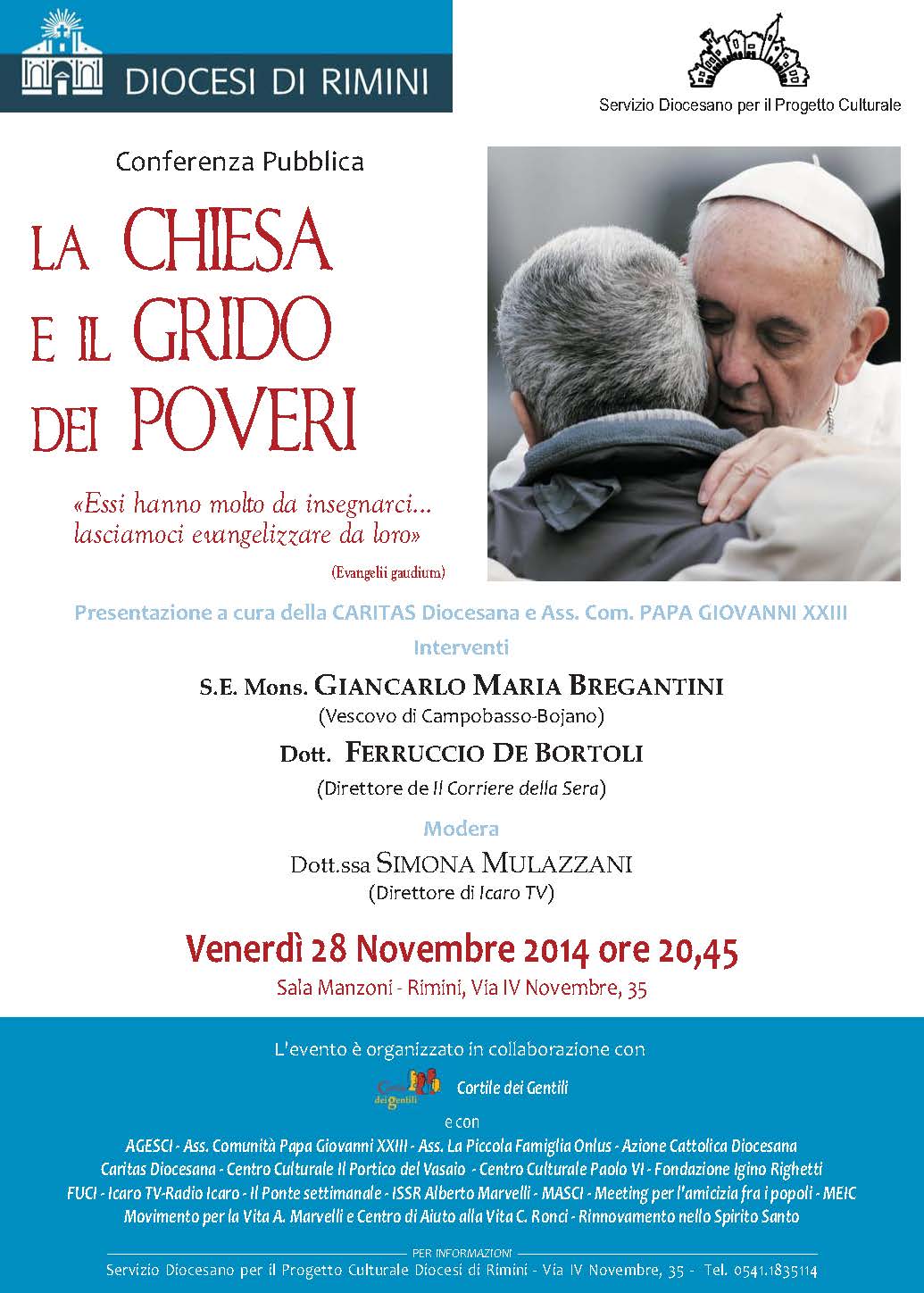Venerdì 28 Novembre 2014, ore 20:45, a Rimini in Sala Manzoni (Via IV Novembre 35) si terrà la Conferenza La Chiesa e il grido dei poveri. I relatori saranno S.E. Mons. Giancarlo Bregantini (Vescovo di Campobasso-Bojano) e il Dott. Ferruccio De Bortoli (Direttore de Il Corriere della Sera). Porteranno i loro saluti anche il Dott. Ernesto Diaco (Vice Responsabile del Servizio Nazionale per il Progetto Culturale) e Padre Laurent Mazas (Direttore Esecutivo del Cortile dei Gentili), oltre al Vescovo di Rimini, S.E. Mons. Francesco Lambiasi.