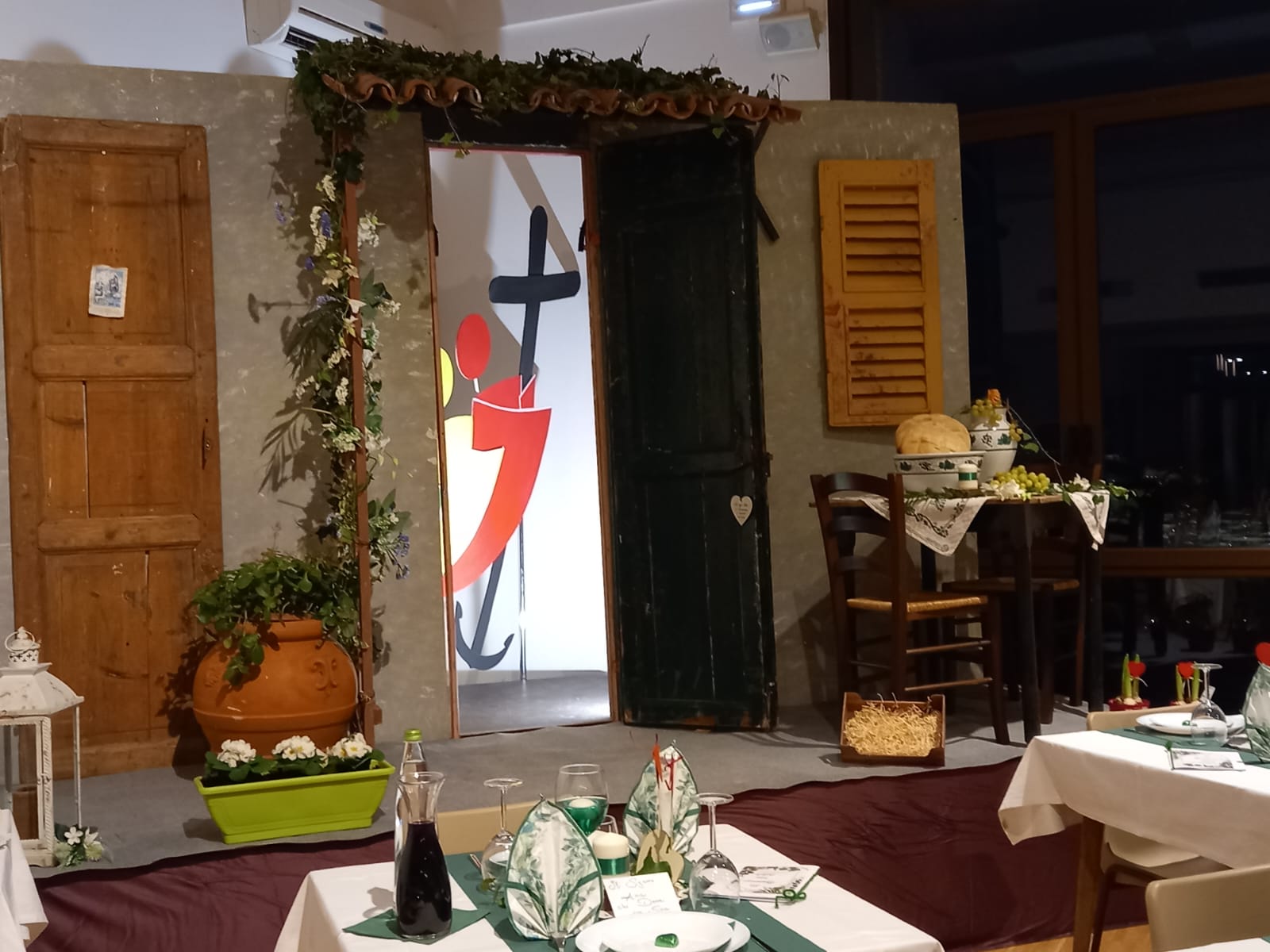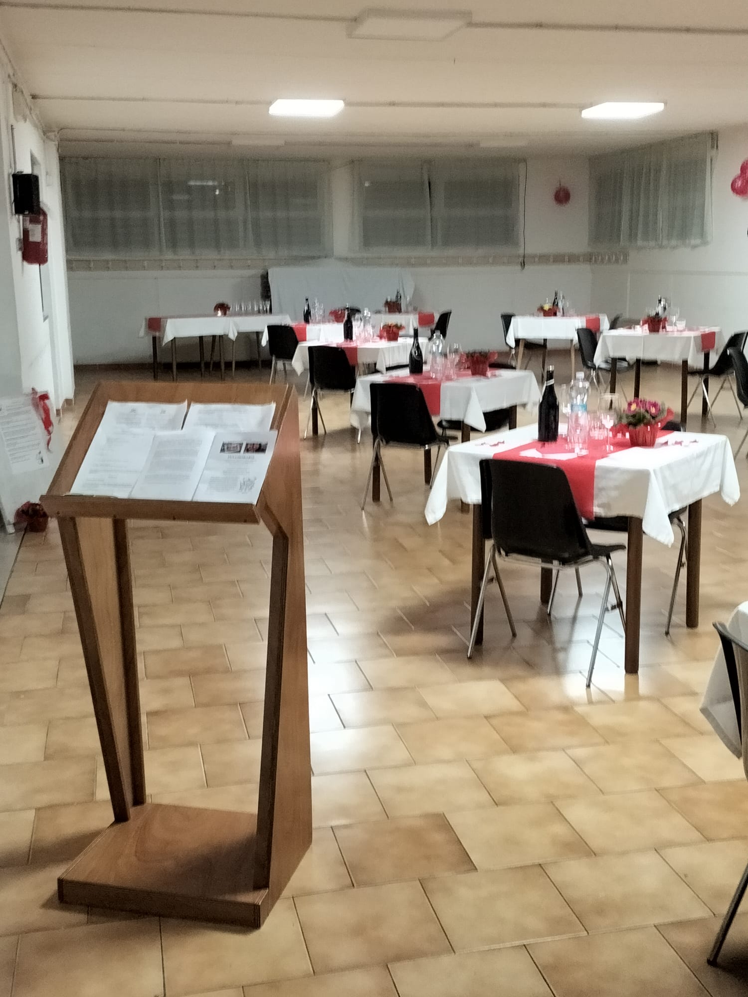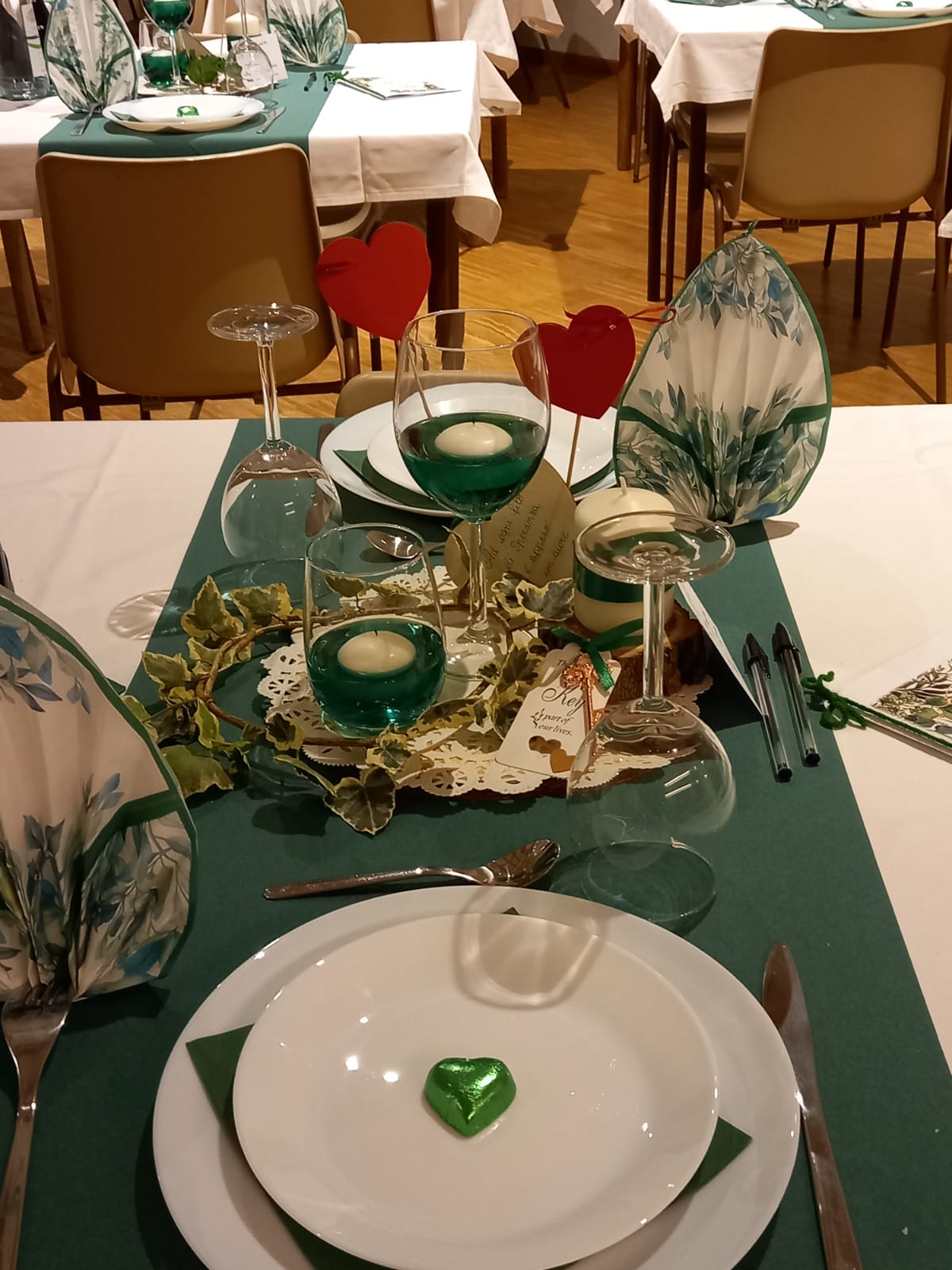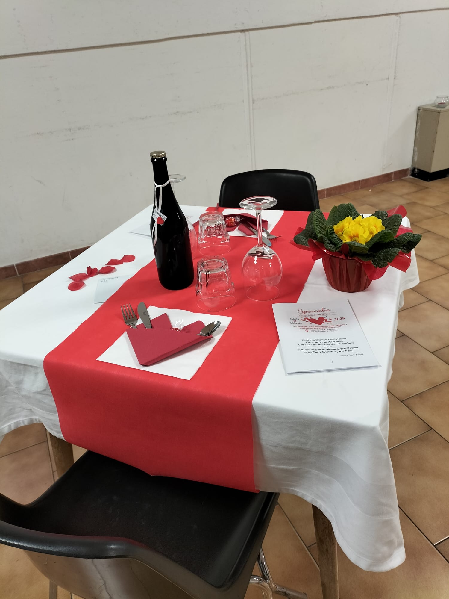 Le trenta coppie presenti sono state accompagnate nel teatro parrocchiale intitolato a Giovanni Paolo II, il santo papa che ha testimoniato una sensibilità meravigliosa per la coppia uomo-donna a partire dalla loro corporeità. Il teatro era allestito come una sala da pranzo curata e con tanti particolari: la candela, il menù a forma di cuore rosso (amore e passione), il porta tovaglioli a forma di cuore realizzati a mano, l’acqua e il vino. I tavoli preparati per la coppia erano separati per garantire l’intimità della donna e dell’uomo, ma non troppo distanti dagli altri tavoli per testimoniare la comunione con le altre coppie. “Ci ha dato l’idea della metafora del corpo umano, formato da cellule, diverse e unite per lo stesso fine. – proseguono il racconto Silvia e Gabriele – E il cibo preparato con grazia e competenza per un prodotto finale.